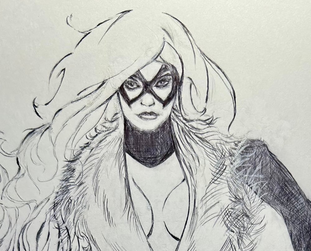 This illustration of Felicia Hardy, The Black Cat is drawn in black ballpoint pen on 9x12 Strathmore Bristol Board with fog effects made by a small battery powered eraser run over dry ink.